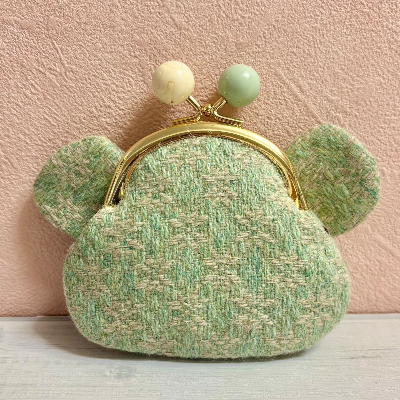 おばあちゃんが古着やボタンを使って作ってくれたつぎはぎのクマちゃんをイメージしたがまぐちです。