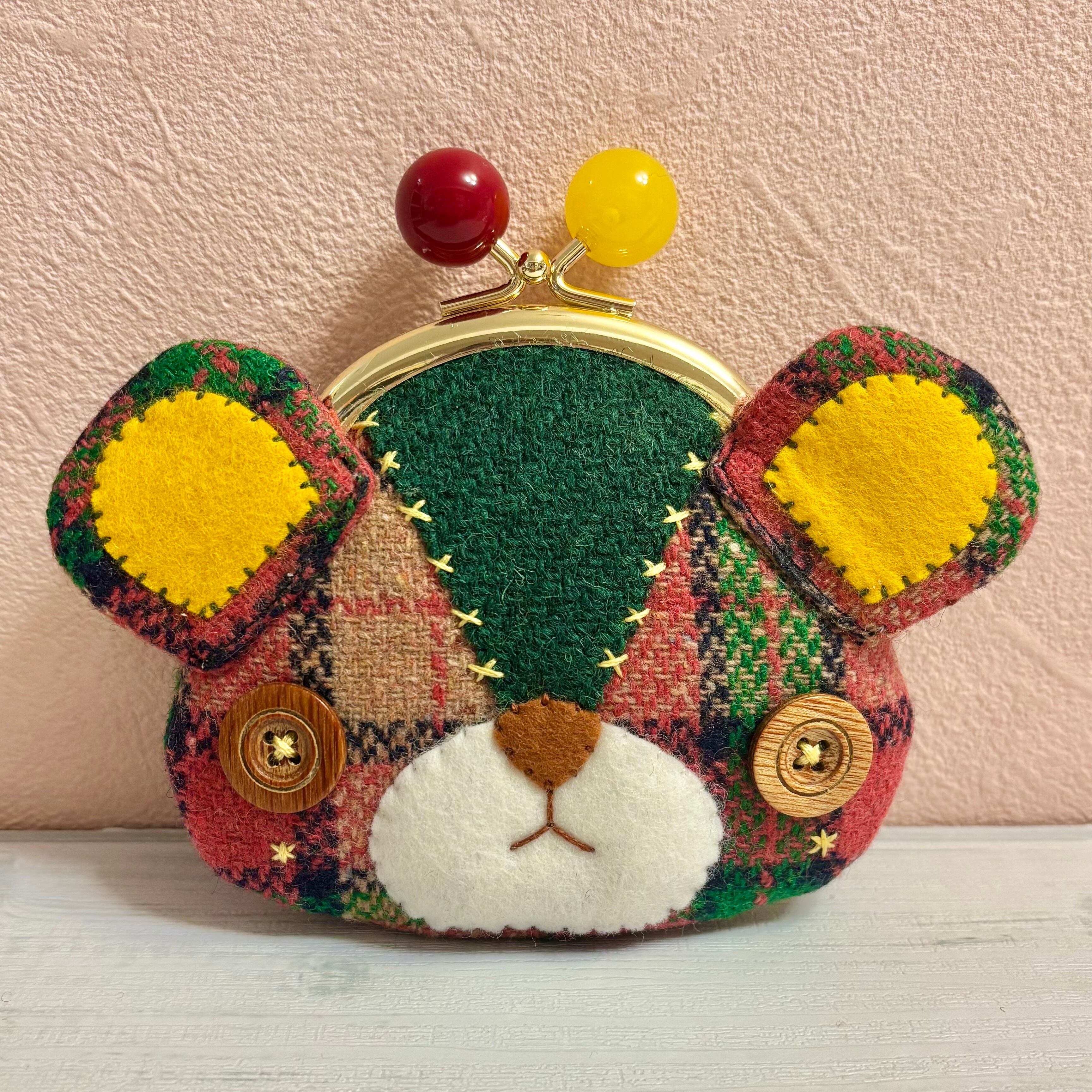 おばあちゃんが古着やボタンを使って作ってくれたつぎはぎのクマちゃんをイメージしたがまぐちです。